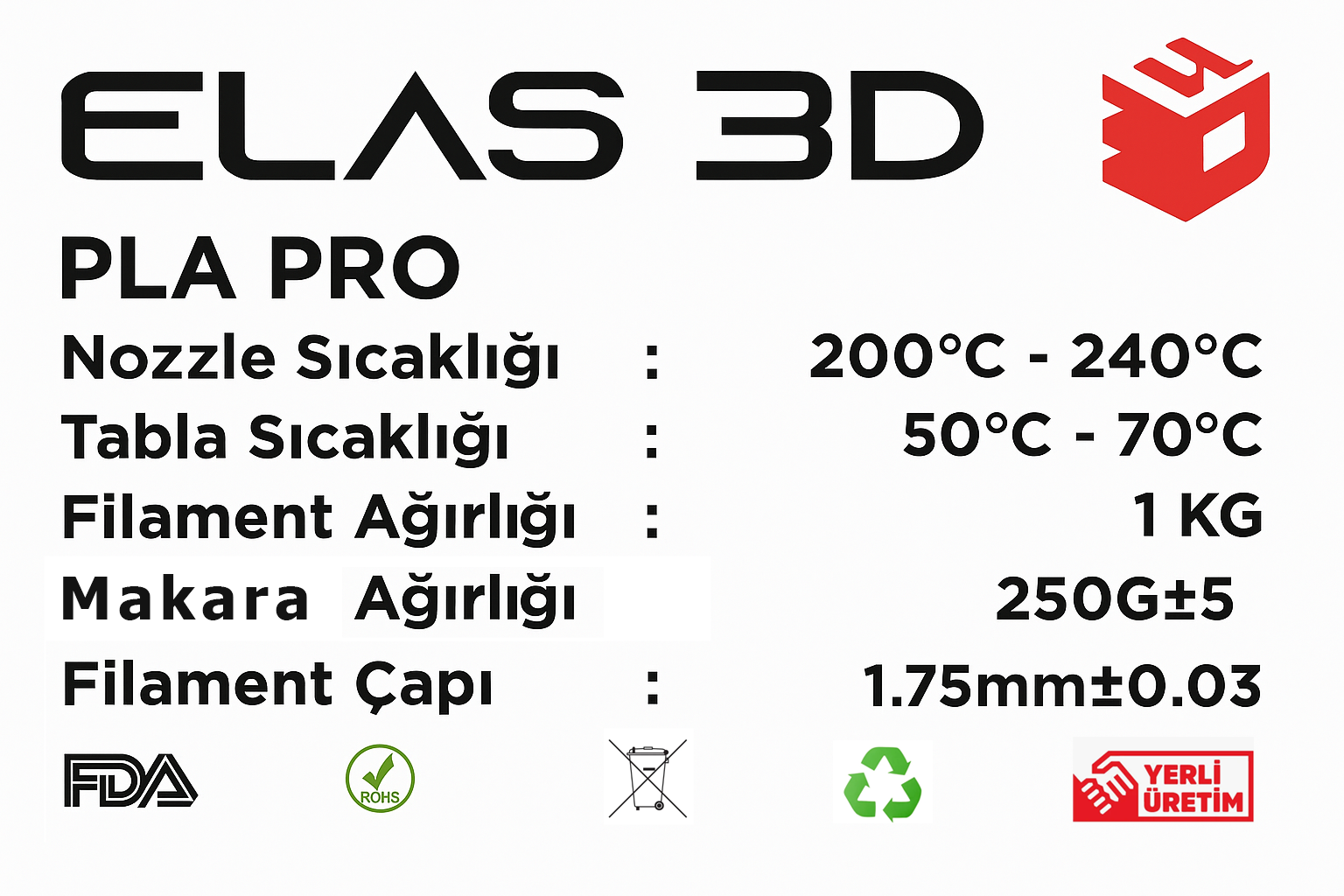 ELAS3D PLA Pro, yüksek baskı kalitesi, güvenilirlik ve sürdürülebilir yapısı ile 3D baskı projelerinizde size profesyonel çözümler sunar. Eğer güçlü, estetik ve uzun ömürlü baskılar elde etmek istiyorsanız, PLA Pro sizin için en doğru tercih olacaktır.