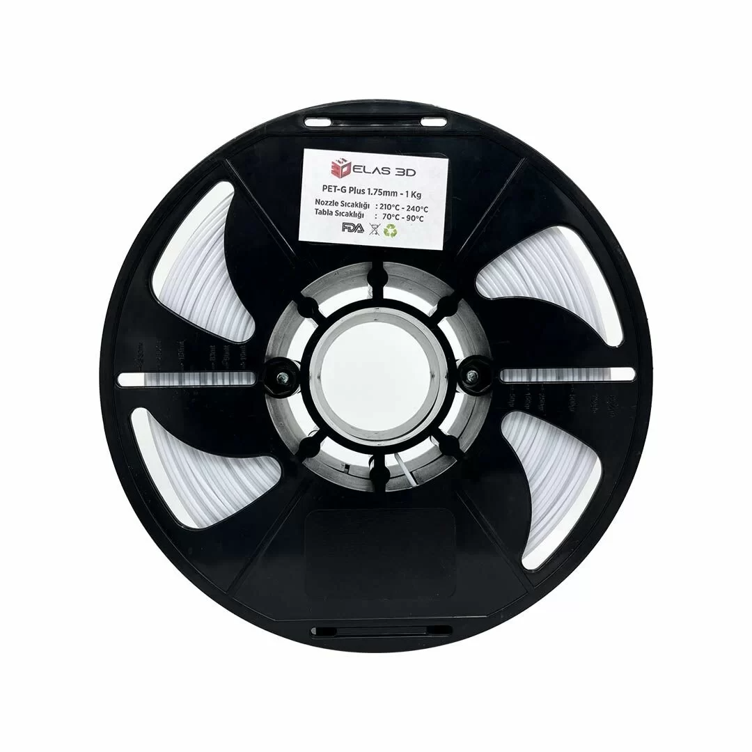 PET-G, Polietilen Tereftalat Glikol olarak adlandırılan, PLA ve ABS filamentlerin güçlü yönlerini bir araya getiren bir termoplastiktir. ABS’ye benzer şekilde darbe dayanımı yüksektir, ancak PLA kadar baskı kolaylığı sunar. Özellikle Beyaz renkli versiyonu, estetik görselliğin önemli olduğu mimari modeller, prototipler ve dekoratif ürünler için idealdir.